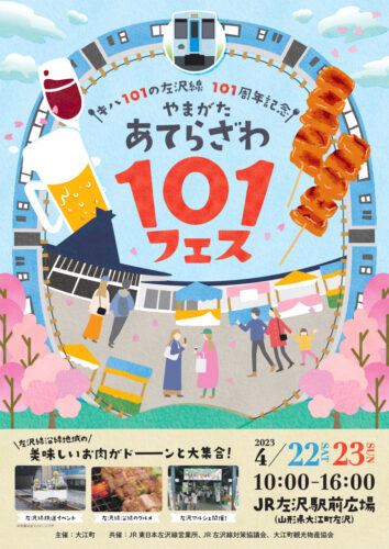 イベント【山形イベント情報4/22〜23】「キハ101の左沢線 101周年記念 やまがた あてらざわ101フェス」が左沢駅前(大江町)で開催されます! 2023年4月23日〜23日、JR左沢駅前広場にて「キハ101の左沢線 101周年記念 やまがた あてらざわ101フェス」が開催されます。 ①キハ1