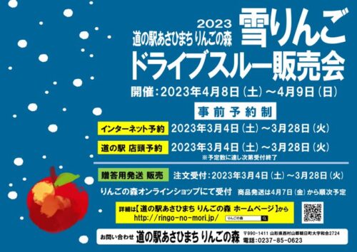 イベント【山形イベント情報4/8・9】「雪りんごドライブスルー販売会」開催(朝日町) 4/8(土)・9(日)、朝日町にて「雪りんごドライブスルー販売会」が開催されます。 道の駅あさひまち公式サイトより引用 「雪りんご