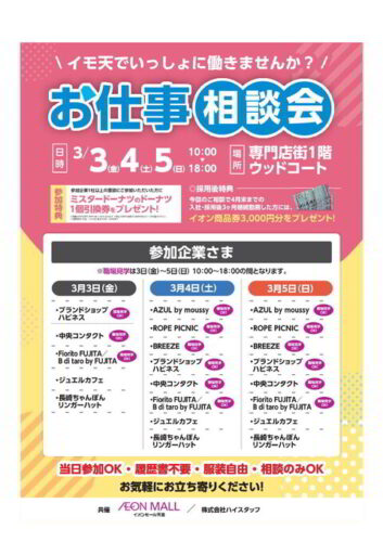 イベント【イベント情報 3/3-5】イオンモール天童でお仕事相談会が開催されるようです! どーも、山形のプチ情報担当ヤマガタロウです! イモ天ことイオンモール天童店で、イモ店のお店などの就職相談会が開催される