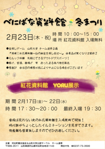 イベント【山形イベント情報2/23】「べにばな資料館 冬まつり」開催(河北町) 2/23(木祝)、河北町の紅花資料館にて「べにばな資料館 冬まつり」が開催されます。 山形県公式観光サイト「やまがたへの旅」より