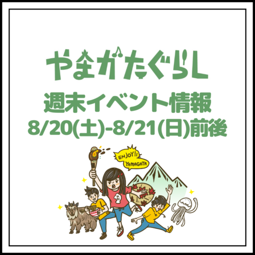 イベント【山形週末イベント情報】8/20(土)、8/21(日)前後のマルシェやイベント等 どーも! やまがたぐらしのイベントおまとめ担当のやまがタロウです! 「イベント情報をまとめてくれ!」というお声を多数い