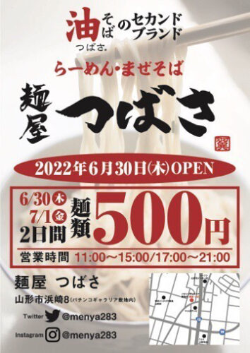 開店・閉店情報【新店情報6/30】麵屋つばさ(山形市浜崎)|油そばつばさのセカンドブランドラーメン店がオープンするようです! 2022年6月30日、山形市浜崎に「麵屋つばさ」さんがオープンするようです! 油そばつばさのセカンドブランドということで楽しみで