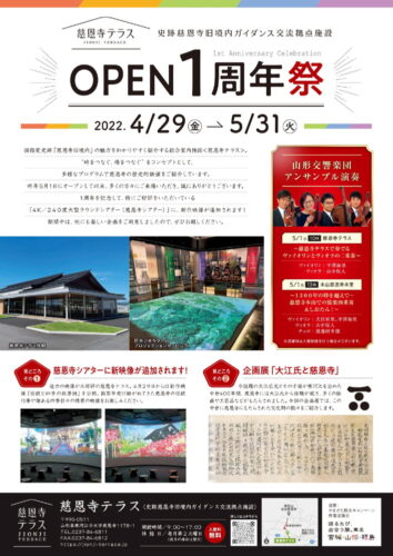 山形の話題【山形イベント情報】慈恩寺テラスOPEN1周年祭が5月末までです! 2022年5月1日にオープンした慈恩寺テラスが1周年を迎えました。 開館1周年を記念して、様々なイベントを開催中なので、ぜひチェッ