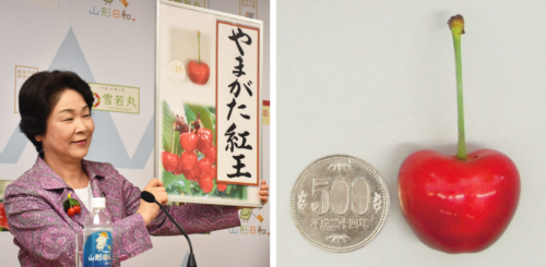 山形の話題【新品種さくらんぼ始動 6/23】500円玉程の大きさの「やまがた紅王」がプレデビュー!!! 県知事から「期待の大型新人」と評されるさくらんぼの新品種やまがた紅王。 開発から20年以上の歳月を経て、ついにプレデビ