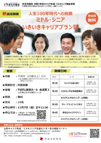 イベント【山形イベント情報】人生100年時代への挑戦!ミドル・シニアいきいきキャリアプラン塾(山形市)セカンドキャリアに向けた第一歩を踏み出してみませんか? 正規・非正規を問わず、さまざまな働き方を経験してきたミドル・シニ
