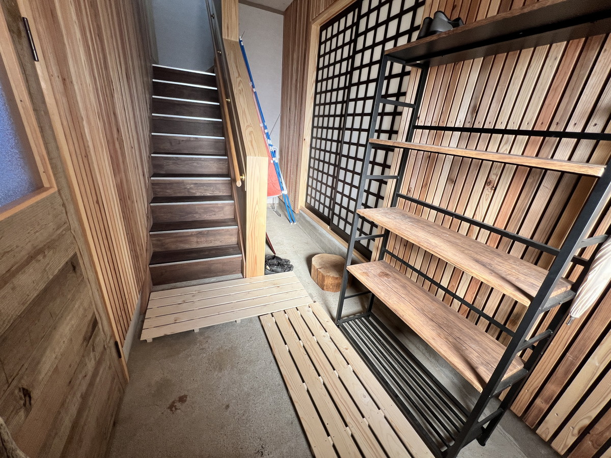 お店に入ると、靴を脱ぐ場所がありました。右の靴置きに靴を収納します。