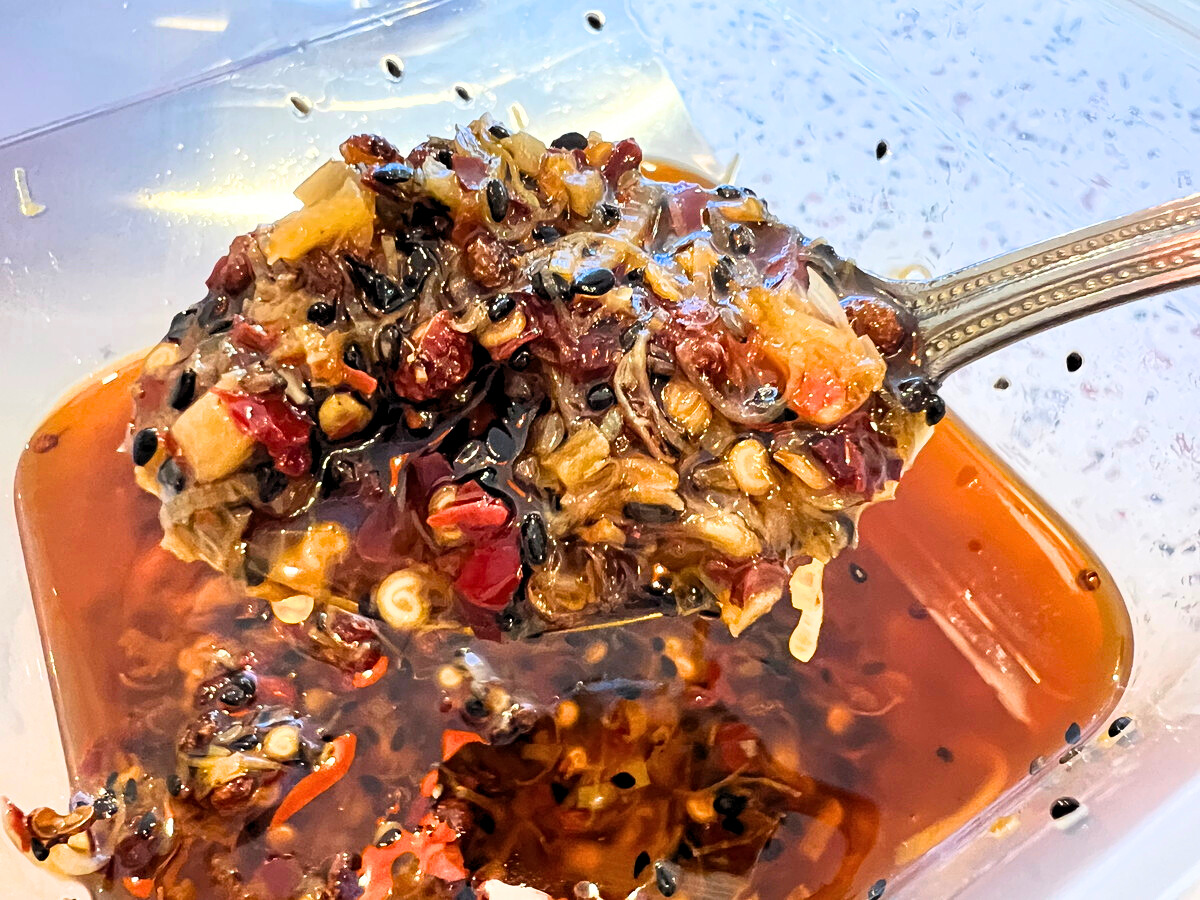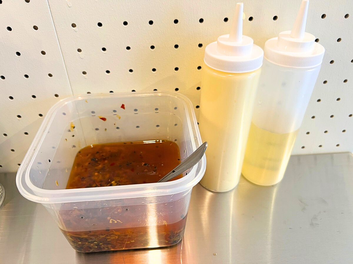お酢・マヨネーズ・フフフ特製ホアジャオや黒ゴマなどが入っているラー油!