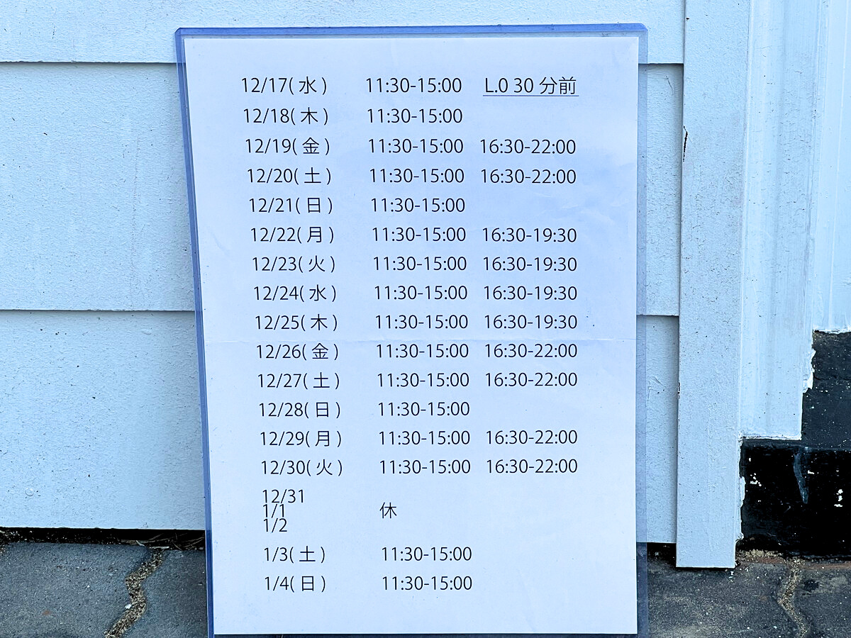 | 営業時間 | 昼 11:30~15:00(L.O30分前) 夜 16:30~22:00 |