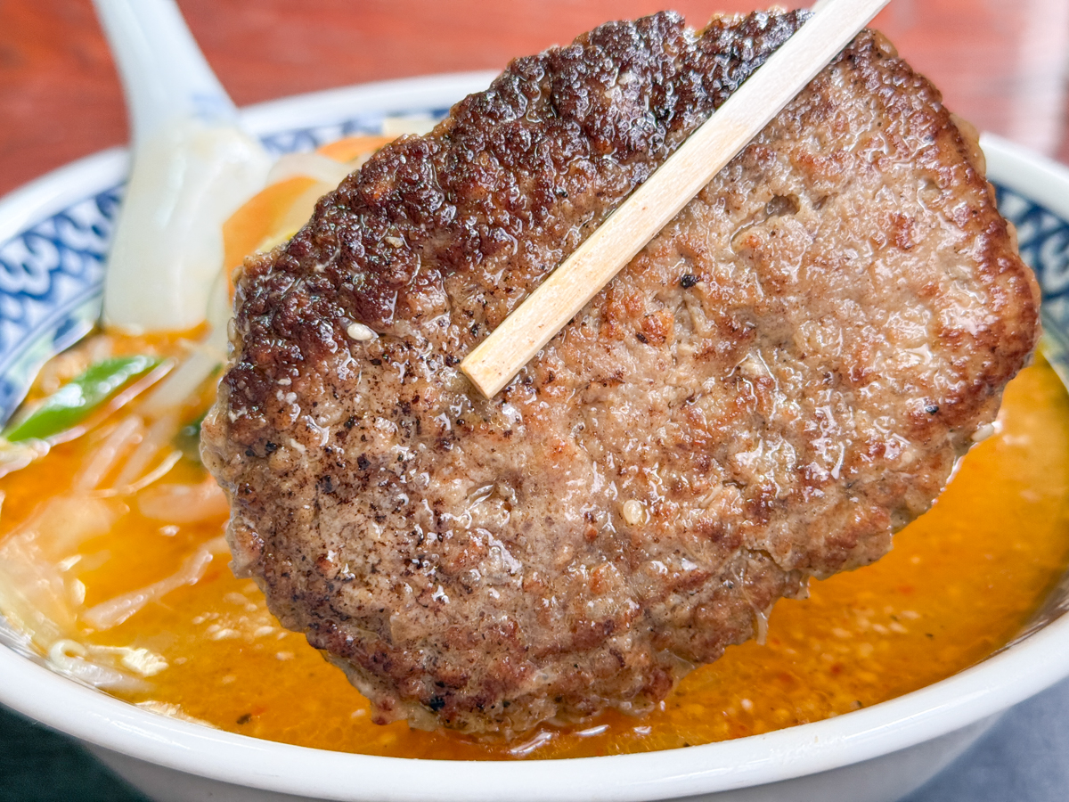 味噌ラーメンの上にハンバーグがのったインパクトのあるビジュアルです。