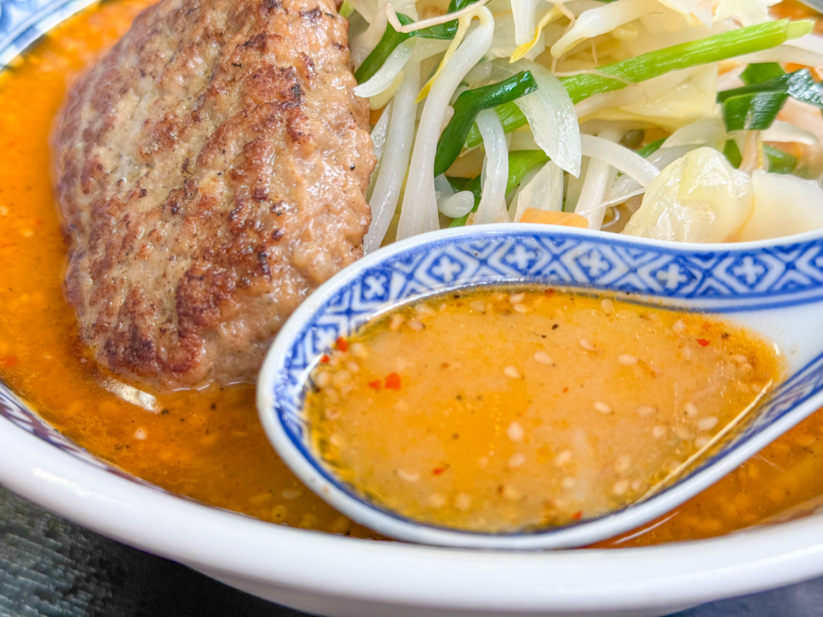 ハンバーグはスープに少し浸してから頬ばると、肉汁と味噌のコクが合わさって“ラーメン×おかず”の良いとこ取り。