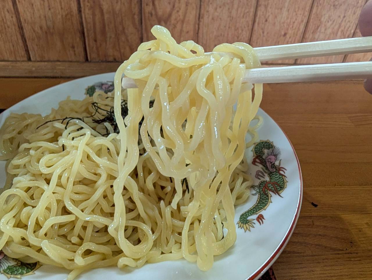 麺は中細の縮れ麺、刻み海苔が上にかかってます。