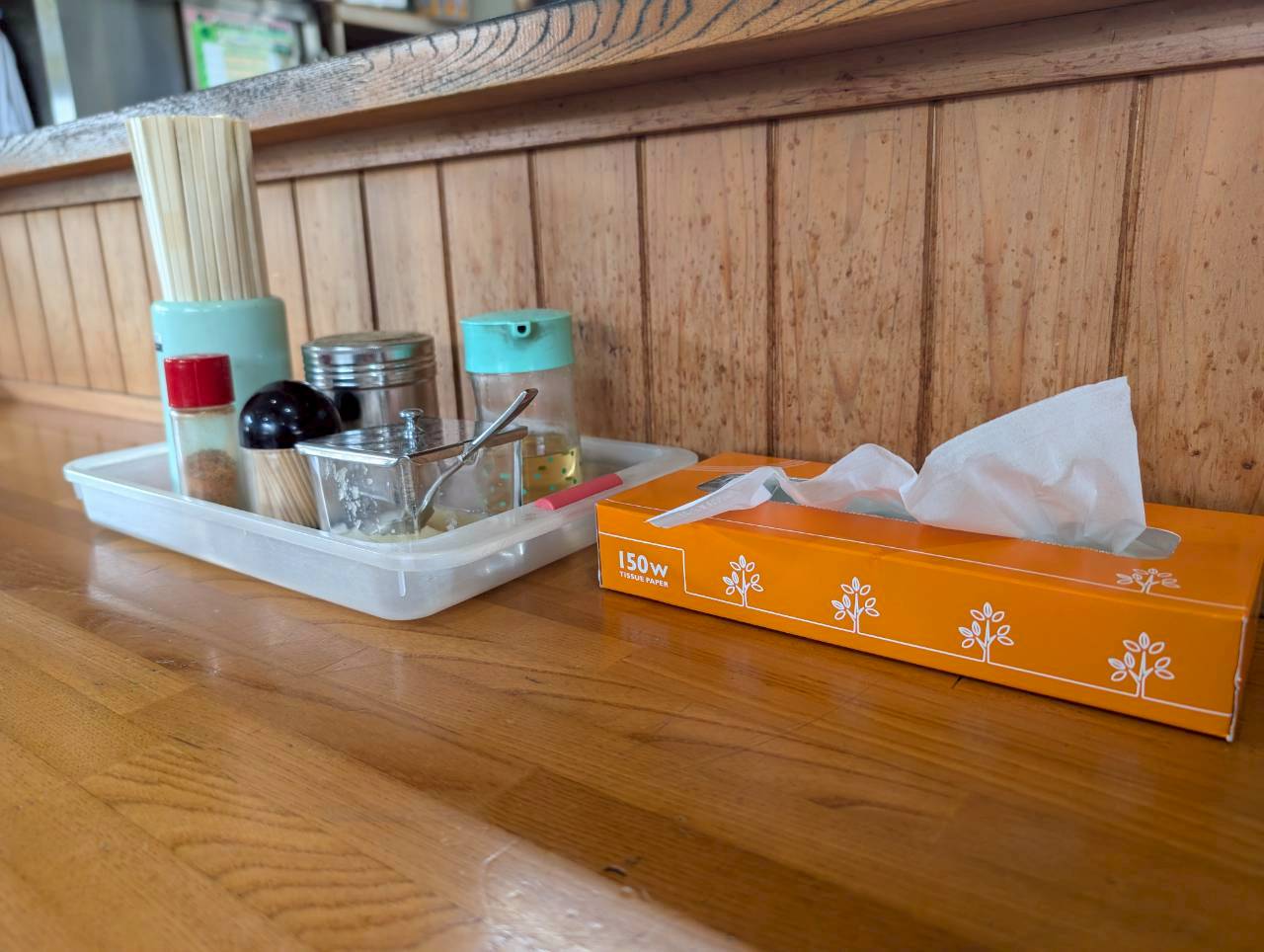 テーブル備え付け品は、割り箸、楊枝、各種調味料、箱ティッシュです。