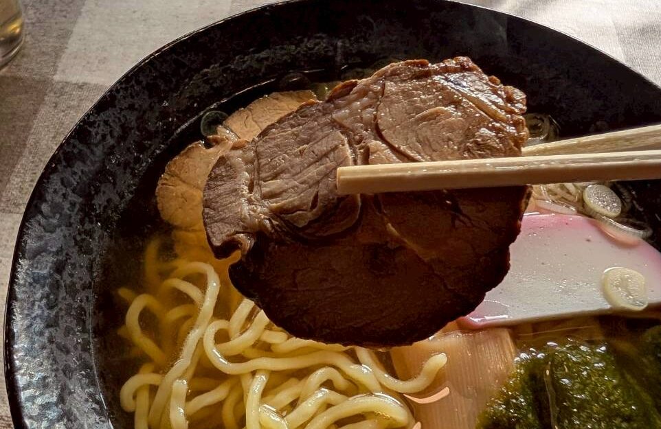 乗ってる具材はチャーシュー、かまぼこ、メンマ、ネギ、焼海苔と言った構成。
