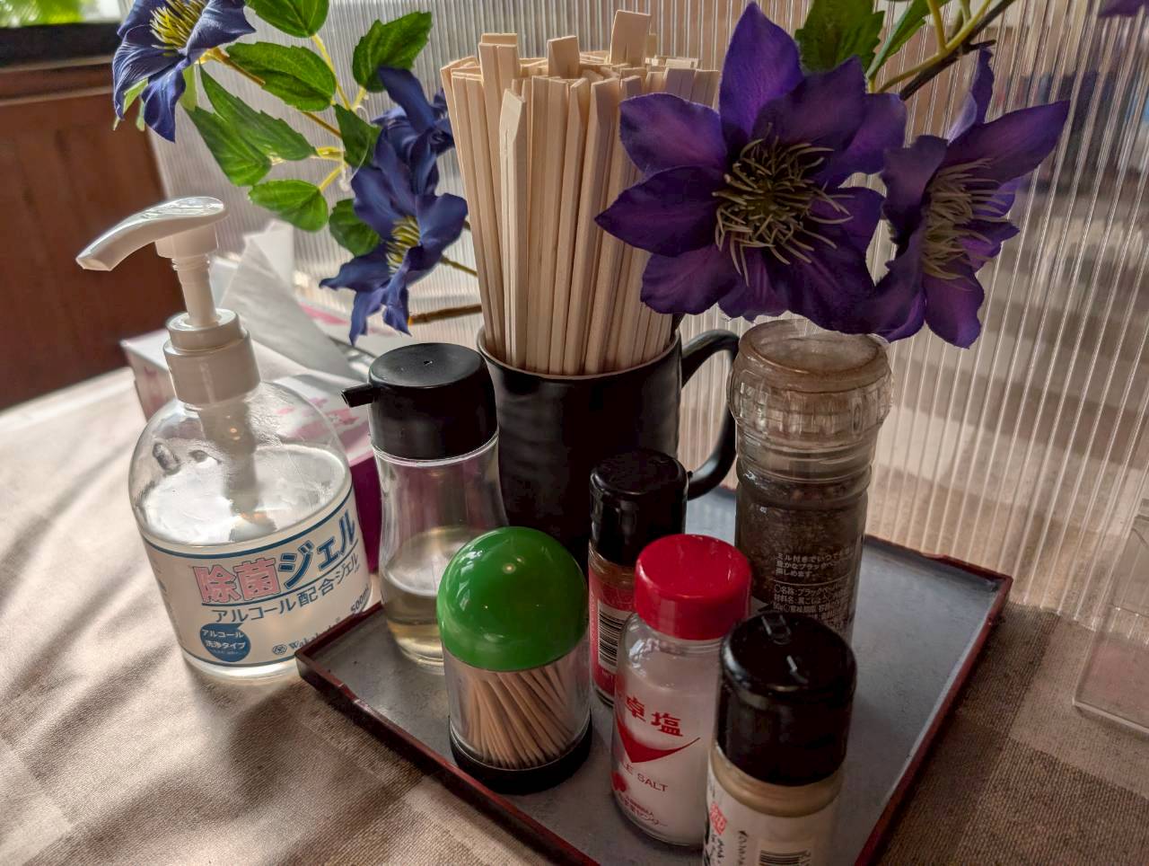 テーブル備え付け品は、胡椒、割り箸、楊枝、お酢、唐辛子、お塩、箱ティッシュと除菌ジェルです。