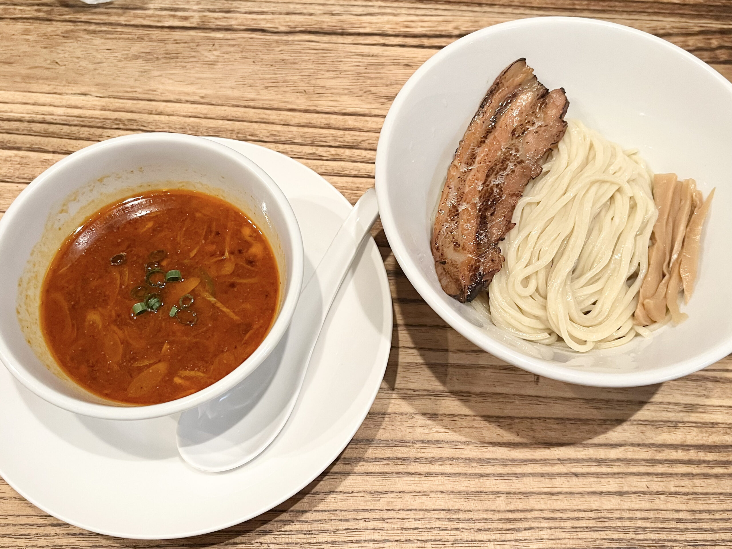 店名にも入っている自慢のチャーシューは、ほろっと口の中でほどけるやわらかさ。ネギたっぷりでピリッと辛さのあるつけ汁に、麺とチャーシューをダイブさせる瞬間がたまりません!