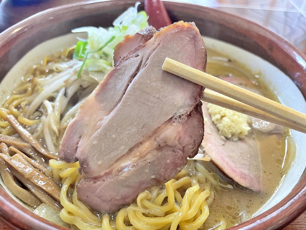 チャーシューに乗っかているおろし生姜を溶かすとさっぱりとした味わいの変化も楽しめます。