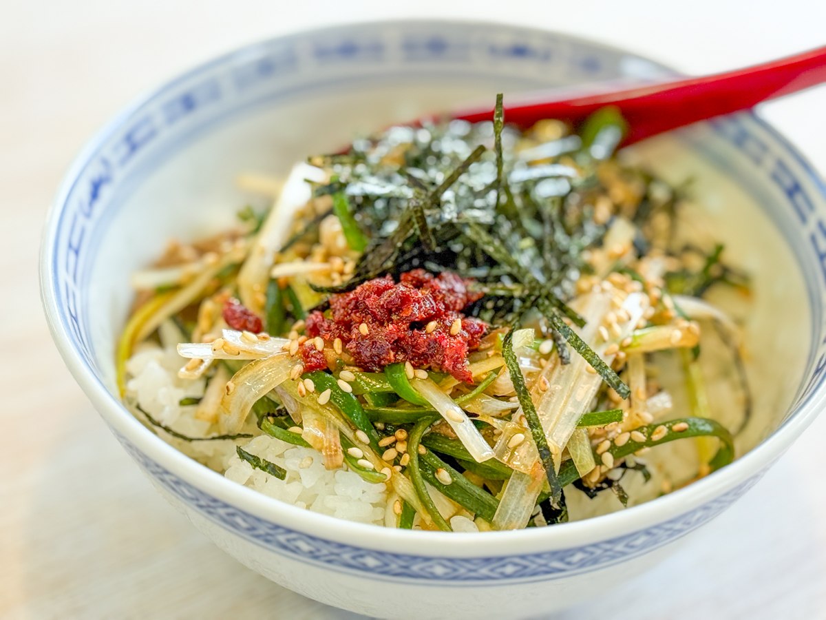 白ごはんに、ねぎ・海苔・旨辛ダレが合わさった、満足感のある丼。