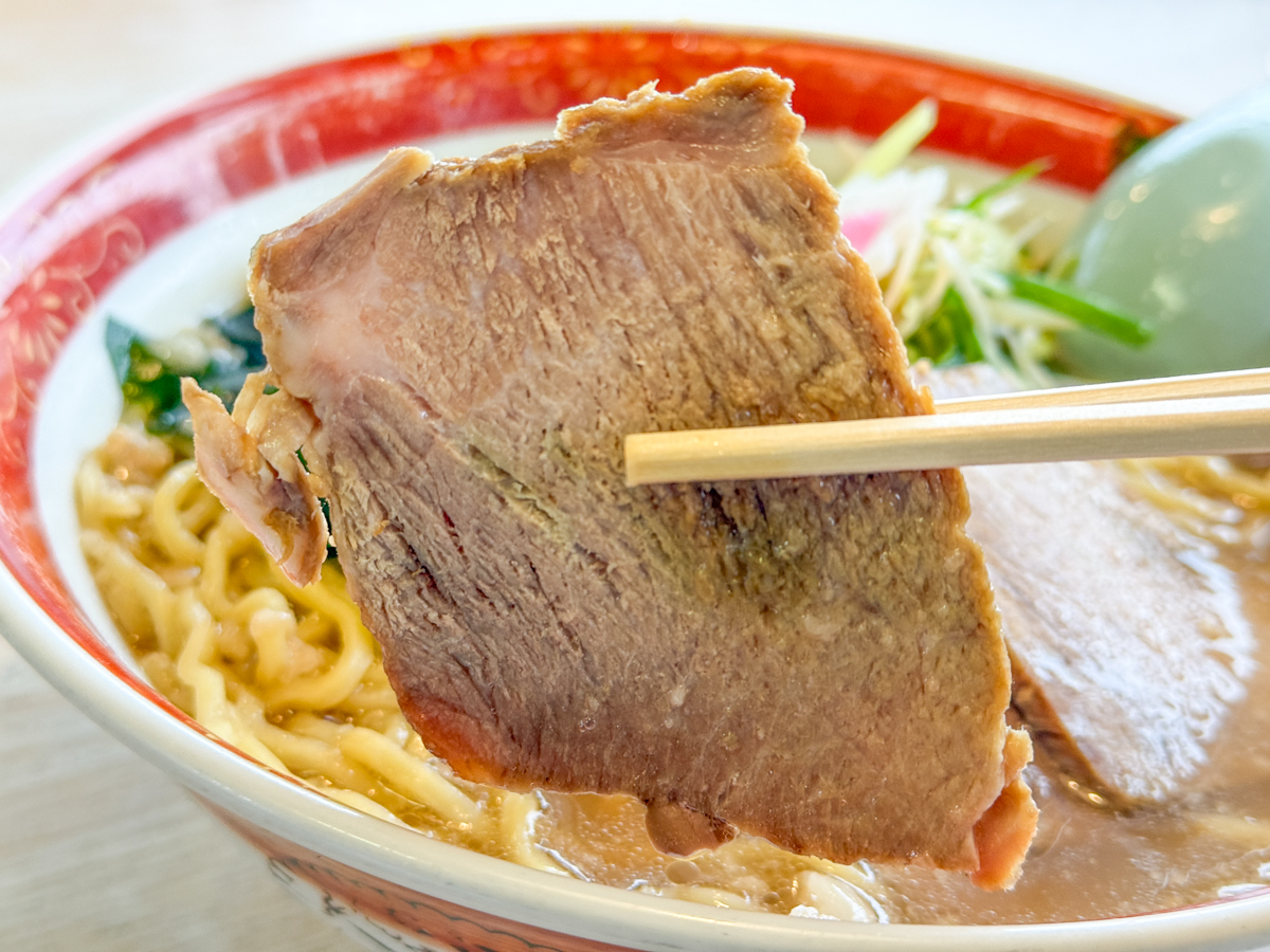 研究を重ねたというお母さんのチャーシューは、噛むほどに旨みが広がるタイプで、スープにも自然になじみます。