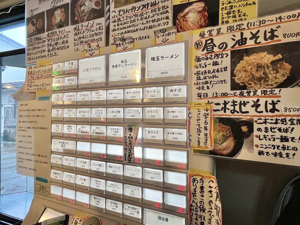 入店したらすぐ右側にこの食券機がありますので、ここから食べたいメニューを選んでくださいね。