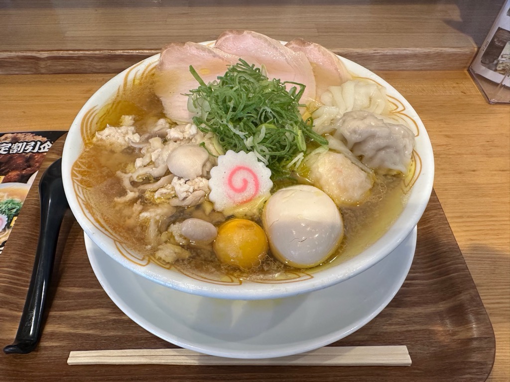 全部入りなので、チャーシュー、海老ワンタン、味玉、海老ワンタンチャーシューと具材も超豪華。