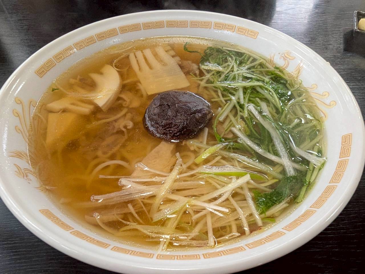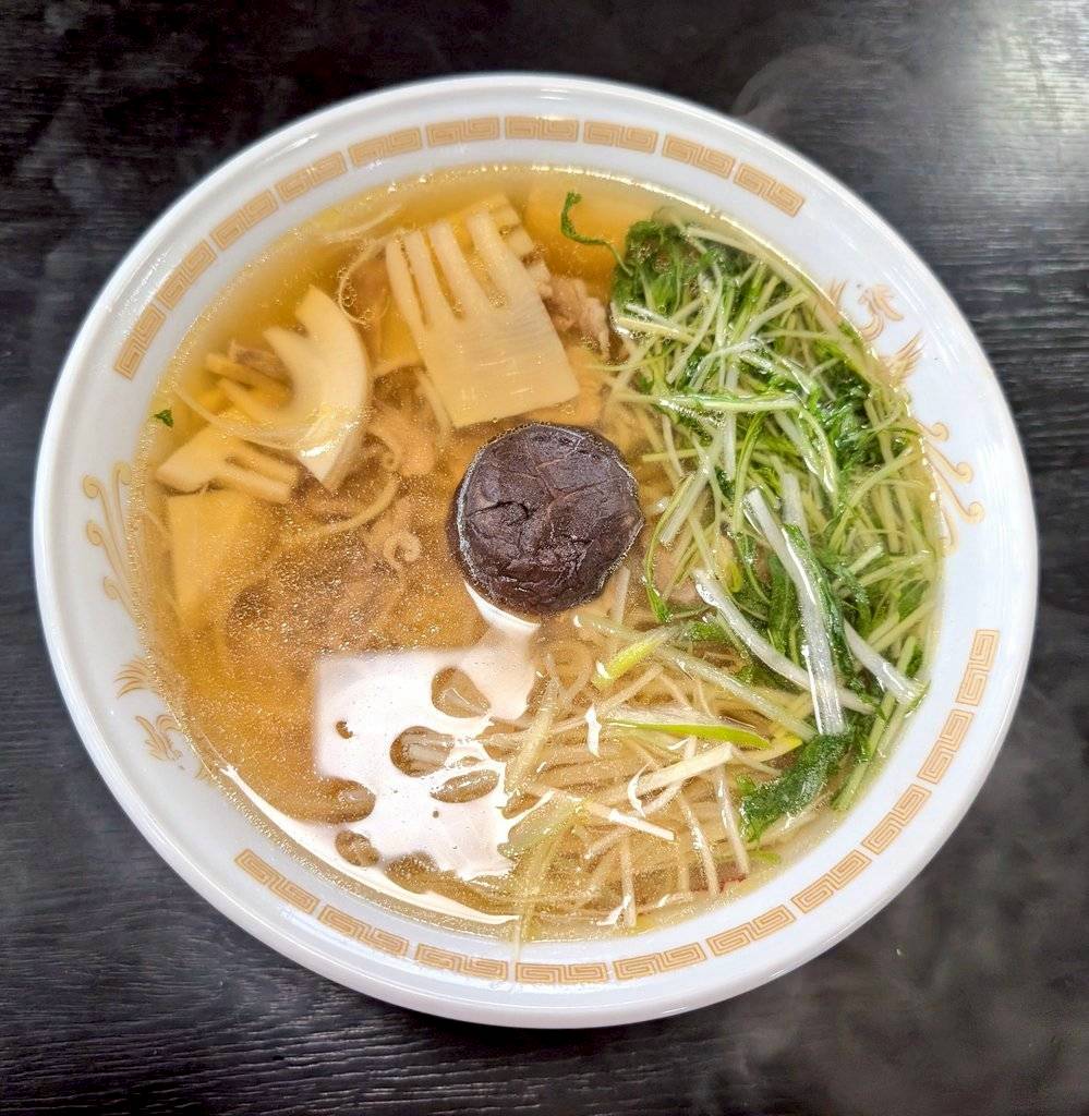 トッピングされた具材は鶏肉、タケノコ、椎茸、ミツバ、ネギ。
