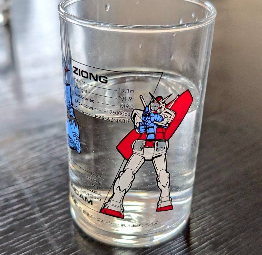 お冷のグラスに皆大好きガンダムが描かれてる!