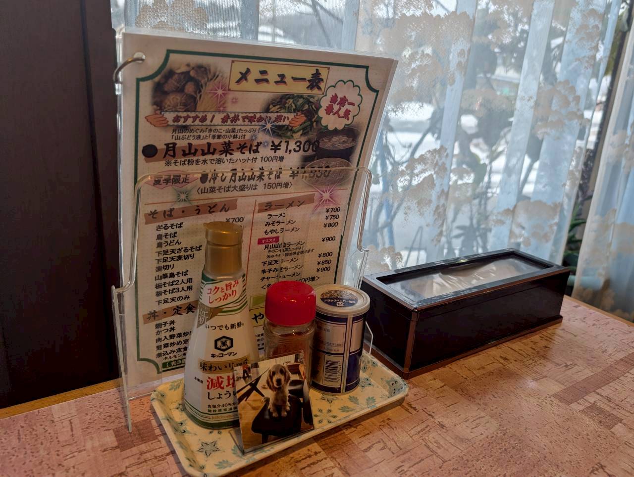テーブル備え付け品は、割り箸、楊枝、各種調味料とお品書きです。