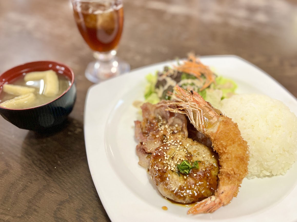 ハンバーグと焼肉と海老フライの3つのメイン料理が一度に楽しめる、お得すぎるセット!!