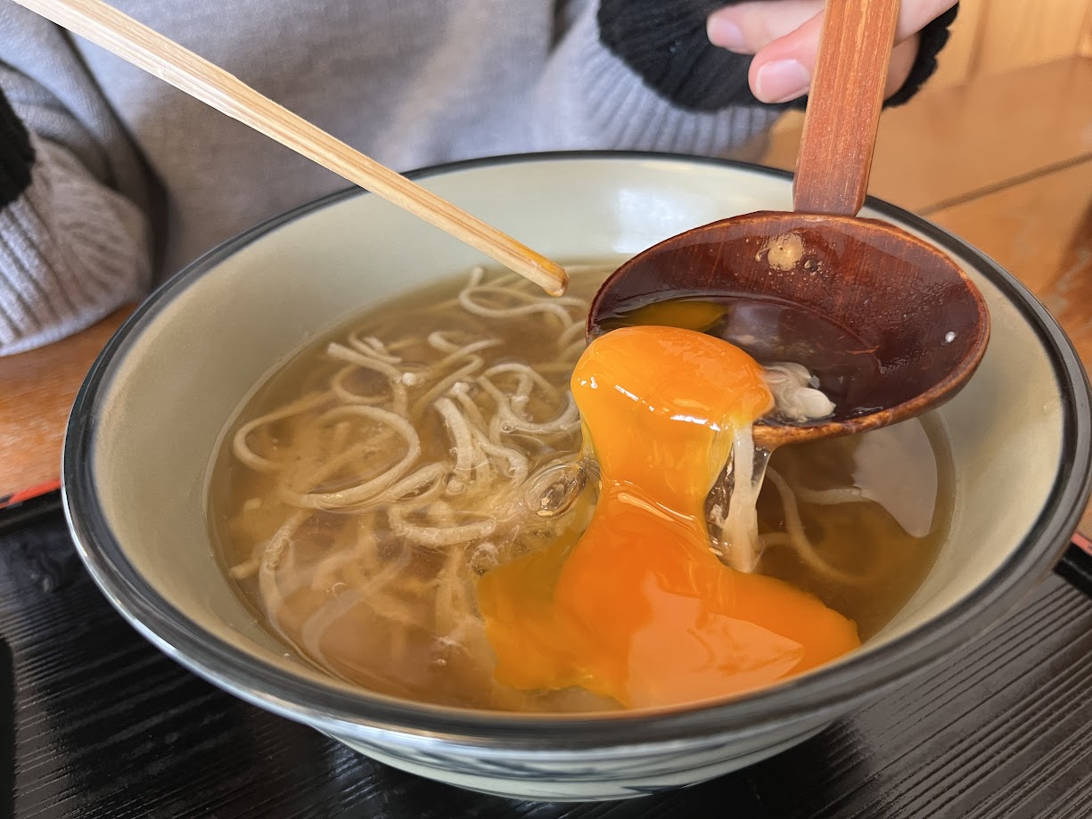お箸で黄身をとろ〜りと崩して、お蕎麦にたっぷり絡めていただきます。