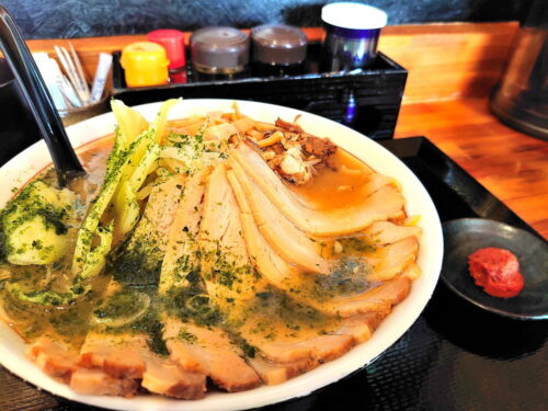 +50円で小エビのトッピングができ、海老の香ばしい匂いが食欲を増進させるので、ぜひトッピングして召し上がってください。