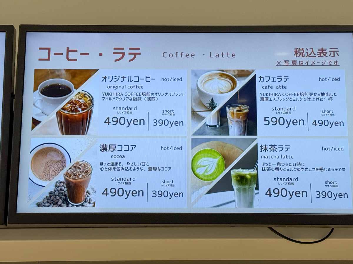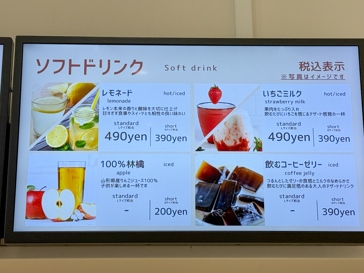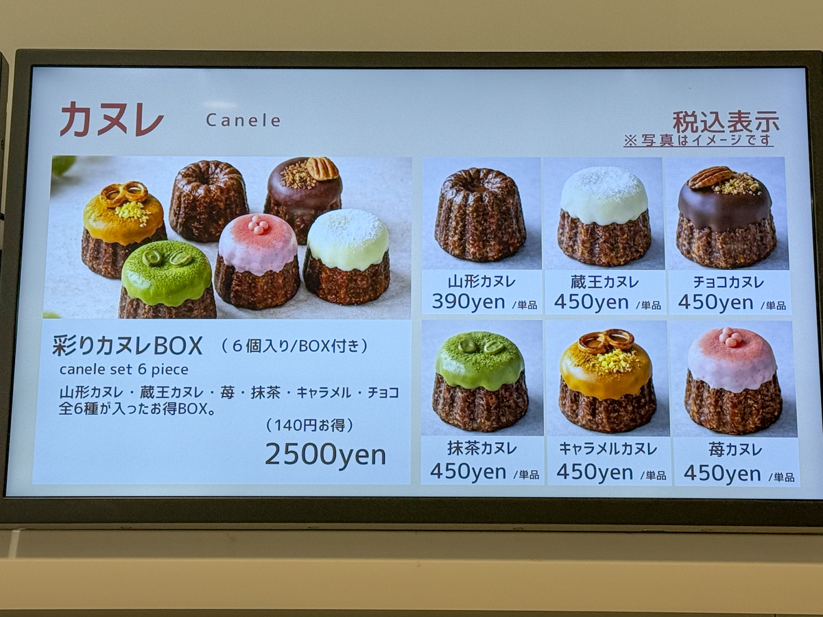休日クレープ他にもカヌレやコーヒー、ラテ、ソフトドリンクなどメニューが充実していました。