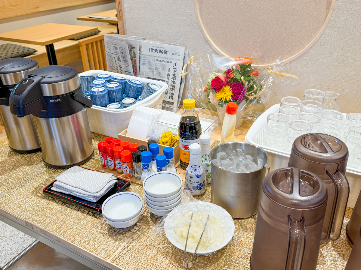 店内中央のテーブルに飲み物や大根おろし、マヨネーズなど味変に嬉しい調味料も揃っていました。