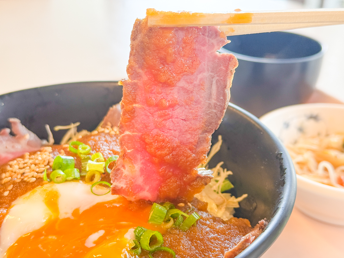 ご飯の上にはローストビーフがたっぷり!さらにはソースがたっぷりかかっていて、温泉卵がトロンと真ん中に。