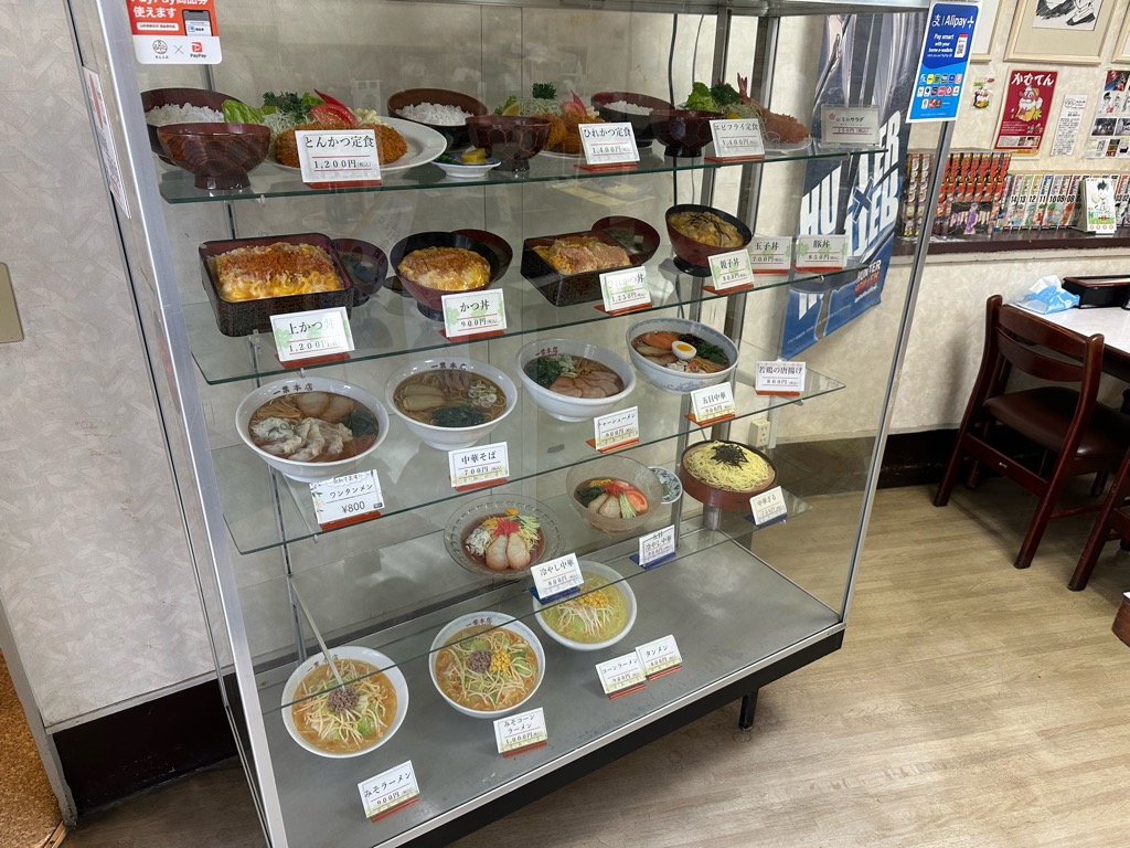 店頭には 食品サンプル が並び、昔ながらの雰囲気が漂います。