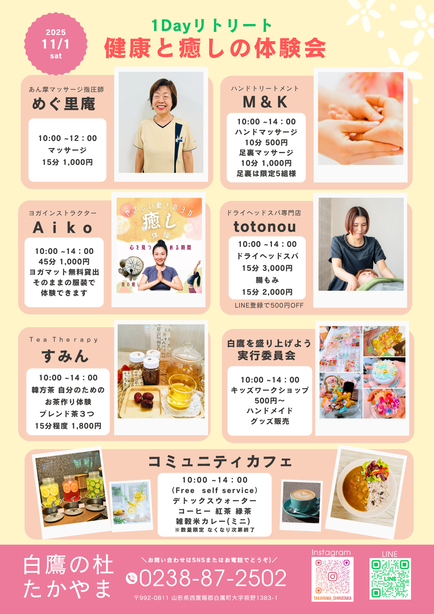【山形イベント情報11/1】1Dayリトリート 健康と癒しの体験会(白鷹町)