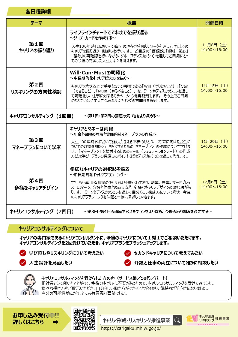 さらに、第2回と第3回の間、そして第4回の後にはキャリアコンサルティングが行われ、継続的なキャリア形成やリスキリング(学び直し)も支援します。