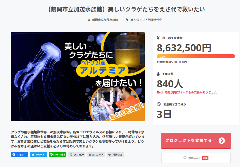【加茂水族館】クラウドファンディングでクラゲたちのエサ代を!!!