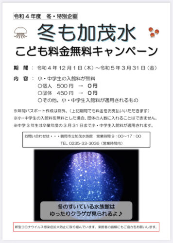 - 12/1~3/31 冬も加茂水!こども料金無料キャンペーン(鶴岡市)