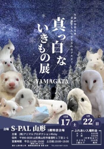 エスパル山形5階特設会場にて「真っ白な生き物展~アルビノ(突然変異)の不思議な生き物・白い動物を見て触れて学ぼう~」が開催されます。