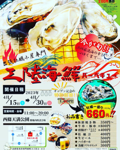 2023年4月15日〜30日まで米沢市の西條天満公園にて「出張牡蠣小屋専門 三陸海鮮バーベキュー」が開催中です!