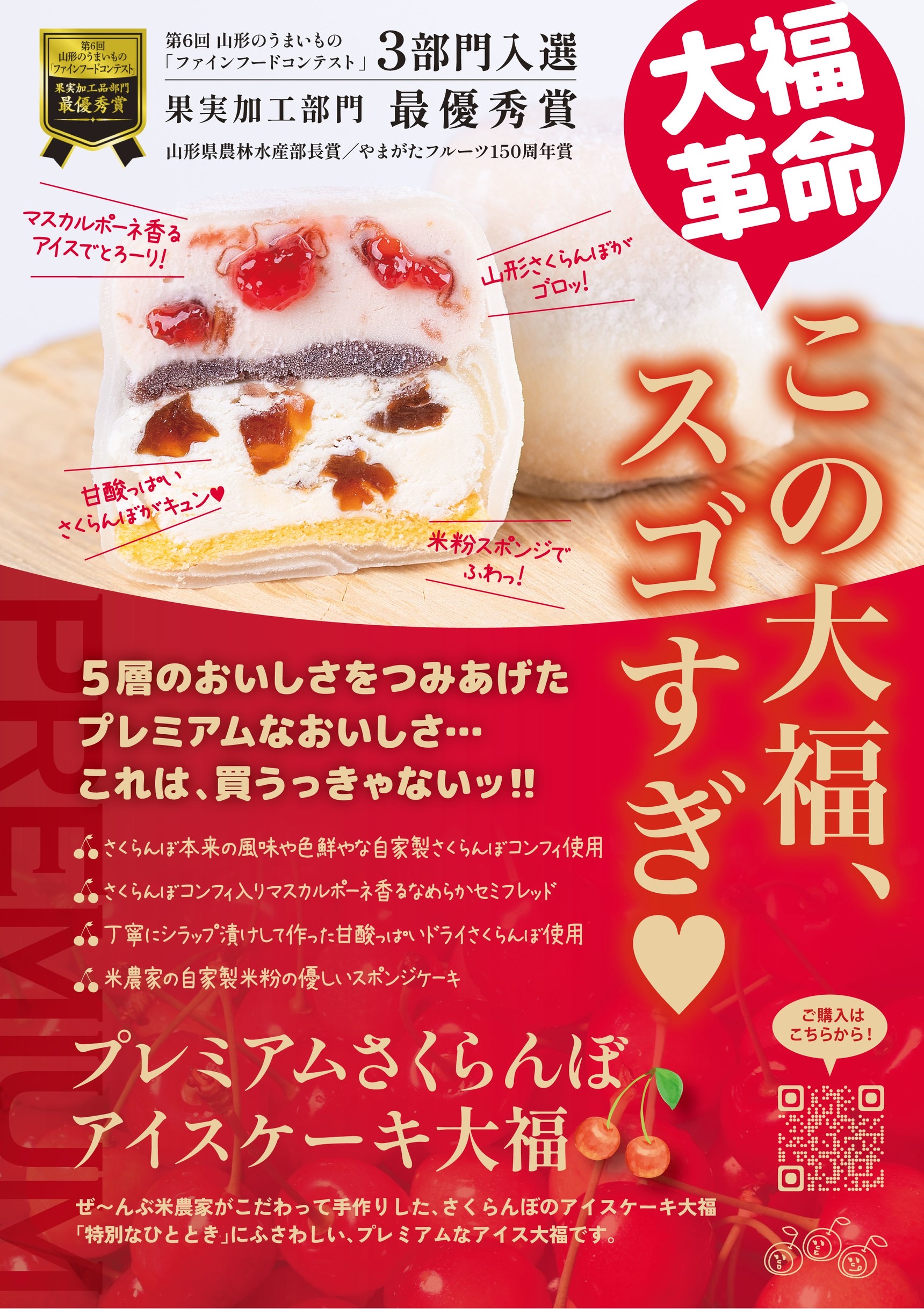 上山市産のさくらんぼと、自家栽培の「はえぬき米」の米粉を使用した贅沢な大福スイーツです。
