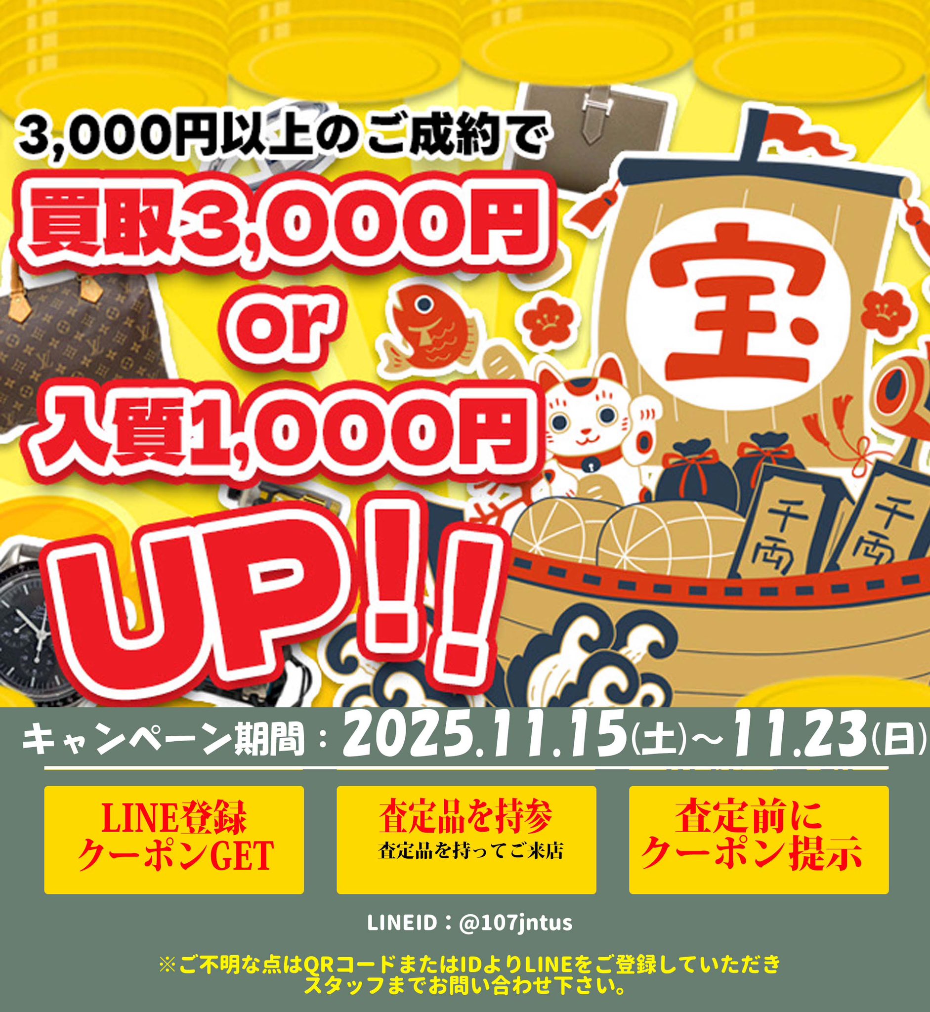 今月は、3,000円以上のお買取りで買取額3,000円UPの特大クーポンです。今回は質にも利用できます!