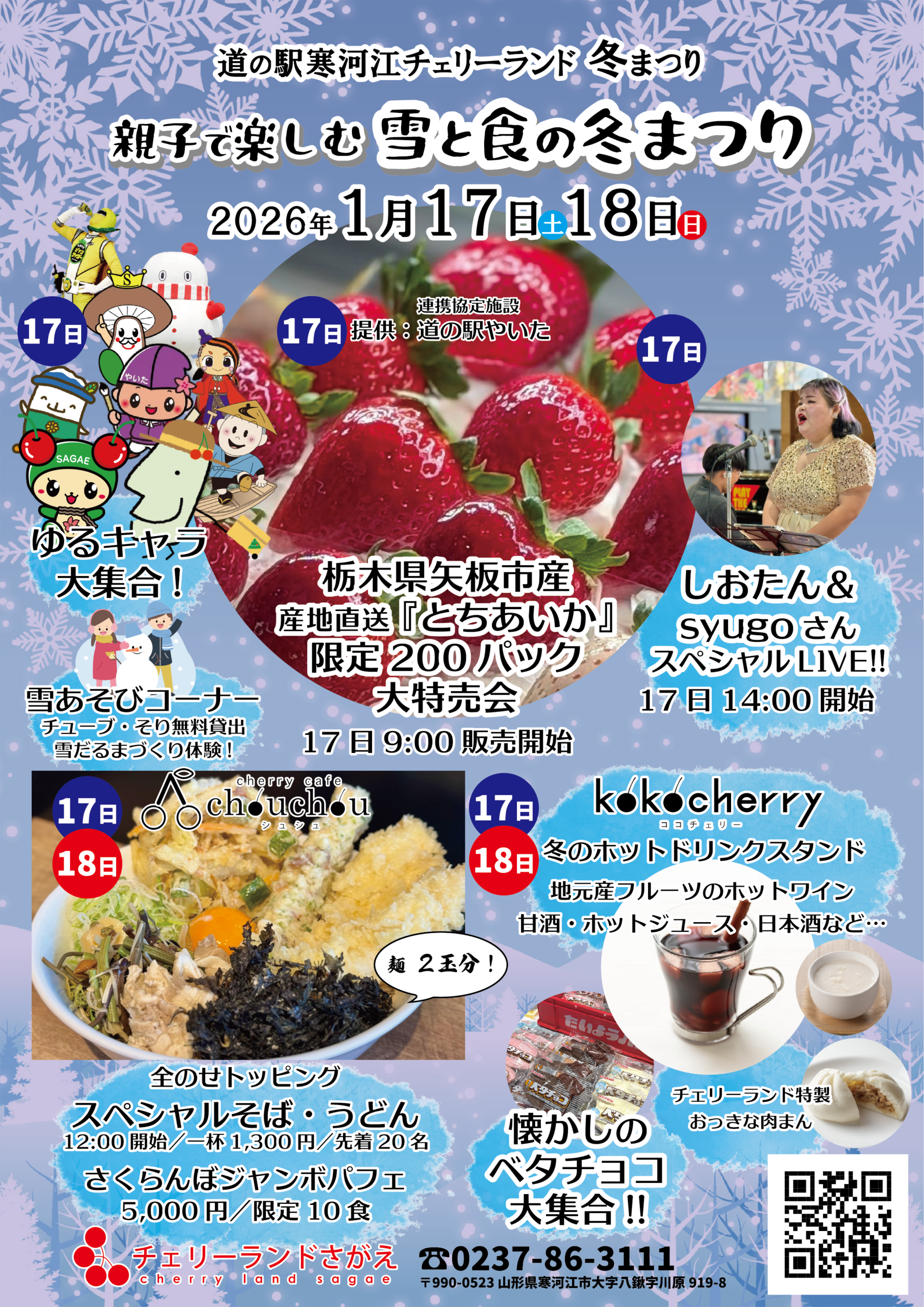 道の駅寒河江チェリーランド冬まつり「親子で楽しむ 雪と色の冬まつり」が行われます。