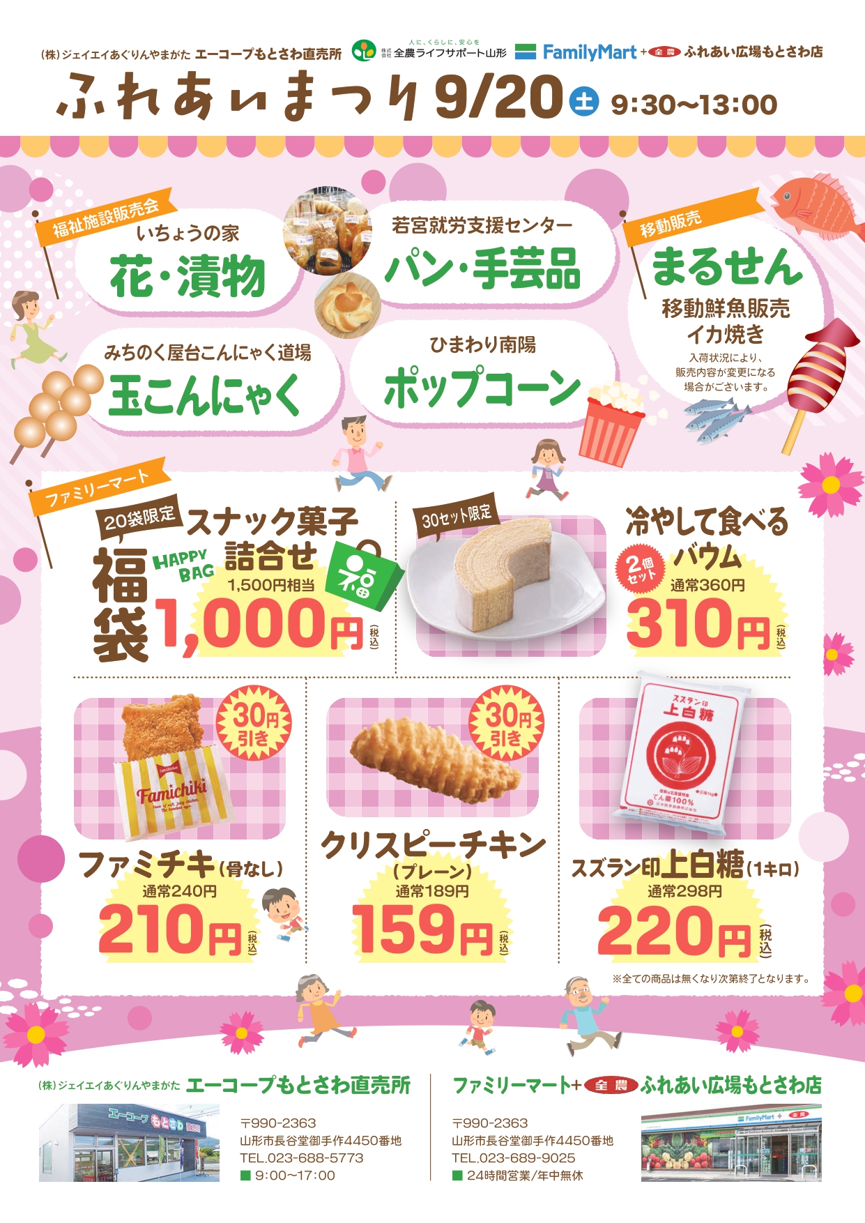 ファミリーマートもとさわ店とエーコープもとさわ直売所がタッグを組み、地域の皆さまに感謝を込めて合同イベントを開催します。