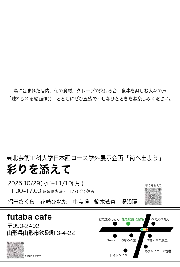 会期は2025年10月29日(水)〜11月10日(月)まで、山形市のfutaba cafeで開催されます(火曜および11月7日(金)は店休日)。