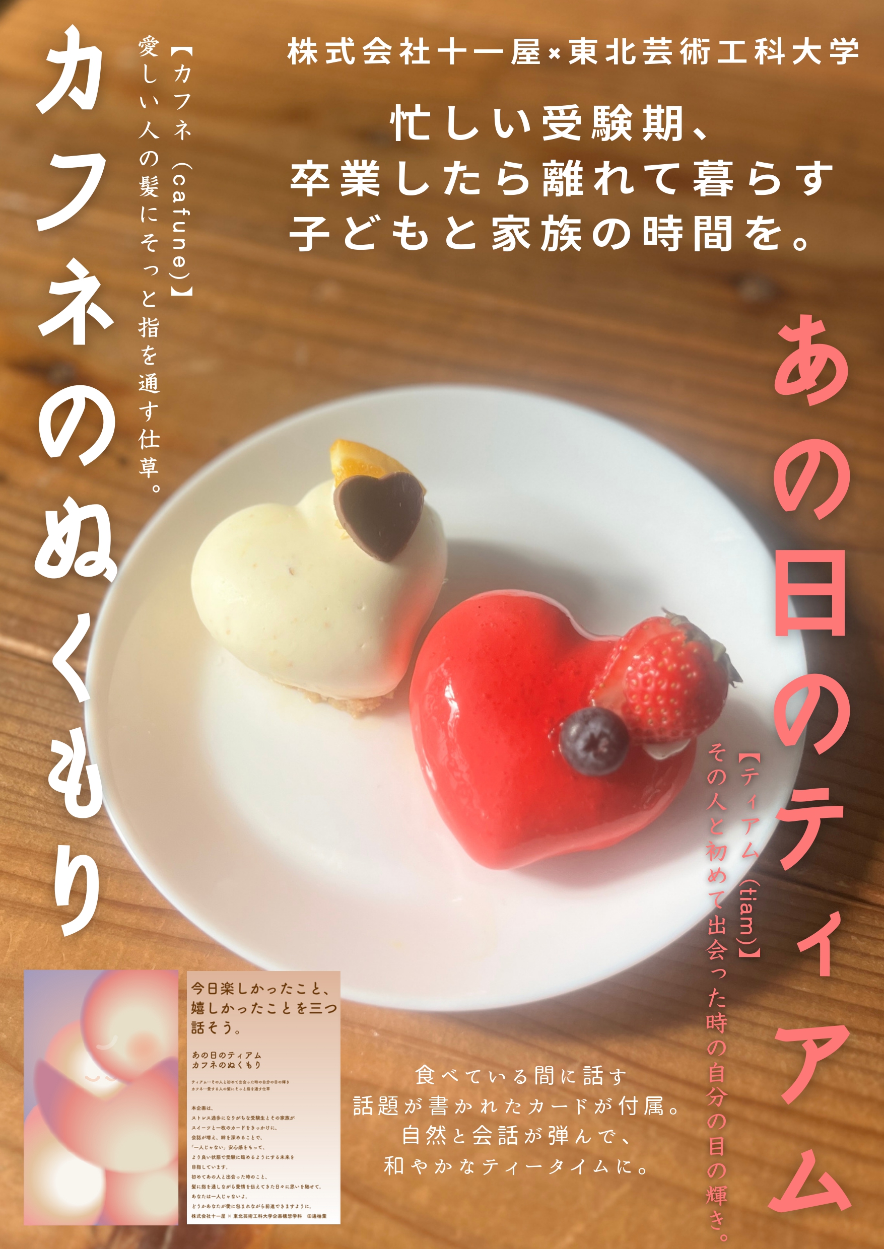 東北芸術工科大学(山形市上桜田/学長:中山ダイスケ)デザイン工学部企画構想学科4年、田邊柚葉(たなべ ゆずは)は、老舗洋菓子店「株式会社十一屋」(山形市上山市/代表:松倉公一)の協力を得て、山形県内のストレス過多になりがちな受験生とその家族に向けた新商品「あの日のティアム」「カフネのぬくもり」を、2026年1月中旬〜2026年2月中旬に株式会社十一屋店舗にて期間限定で販売することになりました。このため、一般のお客様もお呼びした完成披露試食会を2025年12月6日(土)16:00より「十一屋 七日町本店 レストランkitöne(山形市七日町1-4-32)にて開催致します。
