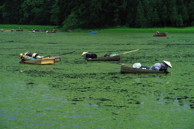 昔ながらの箱舟に乗って行う摘みとり体験。初夏の水面をゆらゆら渡りながら、心ゆくまで収穫しましょう!※摘みとり体験では、ライフジャケットを着用していただきます。