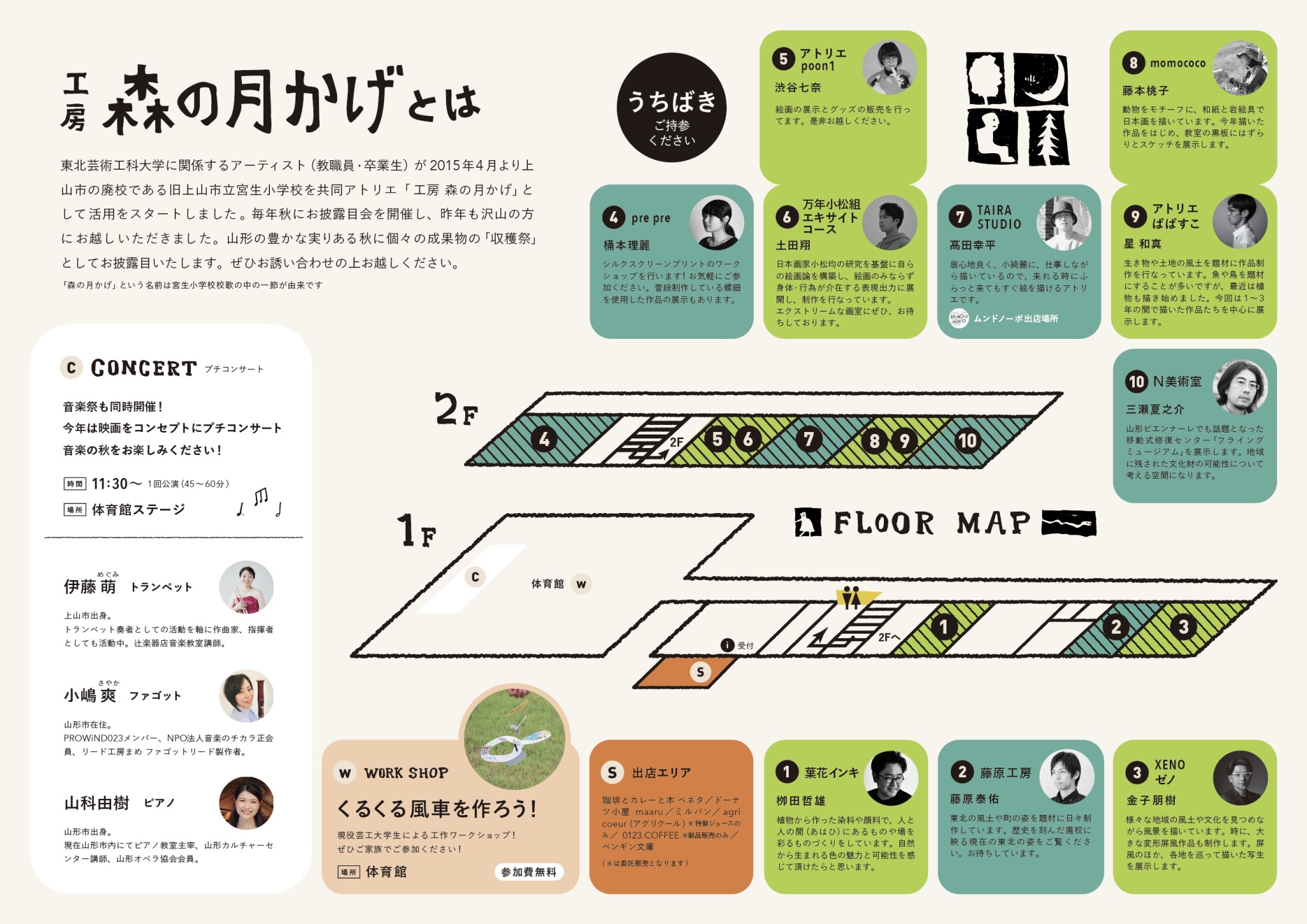 当日は、様々な山形県内の店舗によるご出店や、体育館にて上山市の音楽家 伊藤萌(めぐみ)さんら3名によるプチコンサート、芸工大総合美術コース学生によるご家族向けのワークショップを開催予定です。