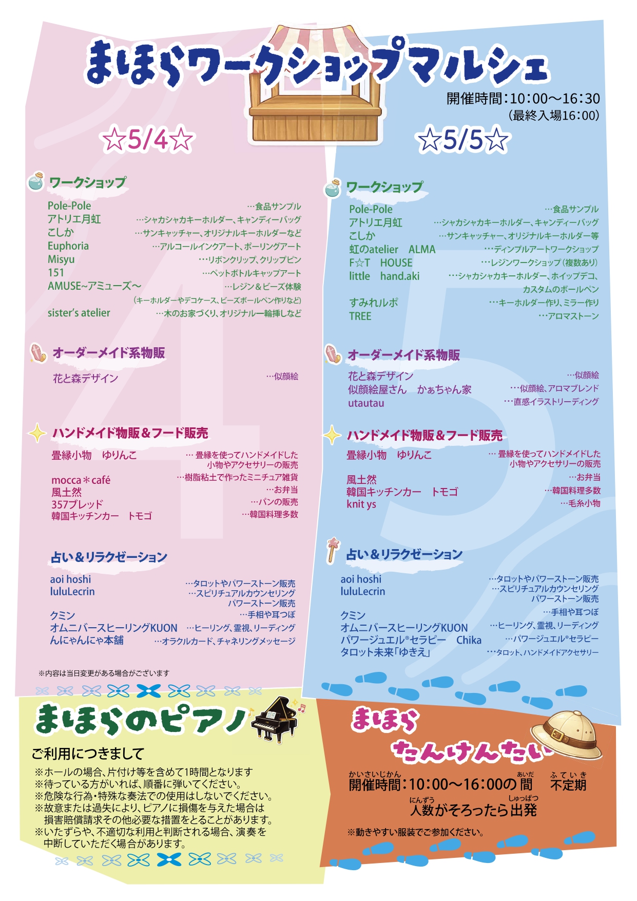 2026年4月30日(木)~5月5日(火)の期間、マルシェやピアノ演奏体験、文化ホールの裏側をめぐる「まほらたんけんたい」など、こどもから大人まで楽しめるGWイベントを開催します!
