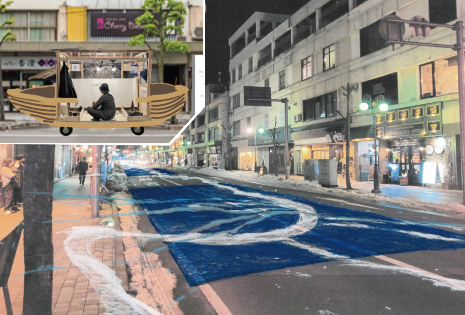山形駅前「大手門通りすずらん商店街」が歩行者天国の美術館となり、テラス席で飲食をとりながらアートを楽しめます。